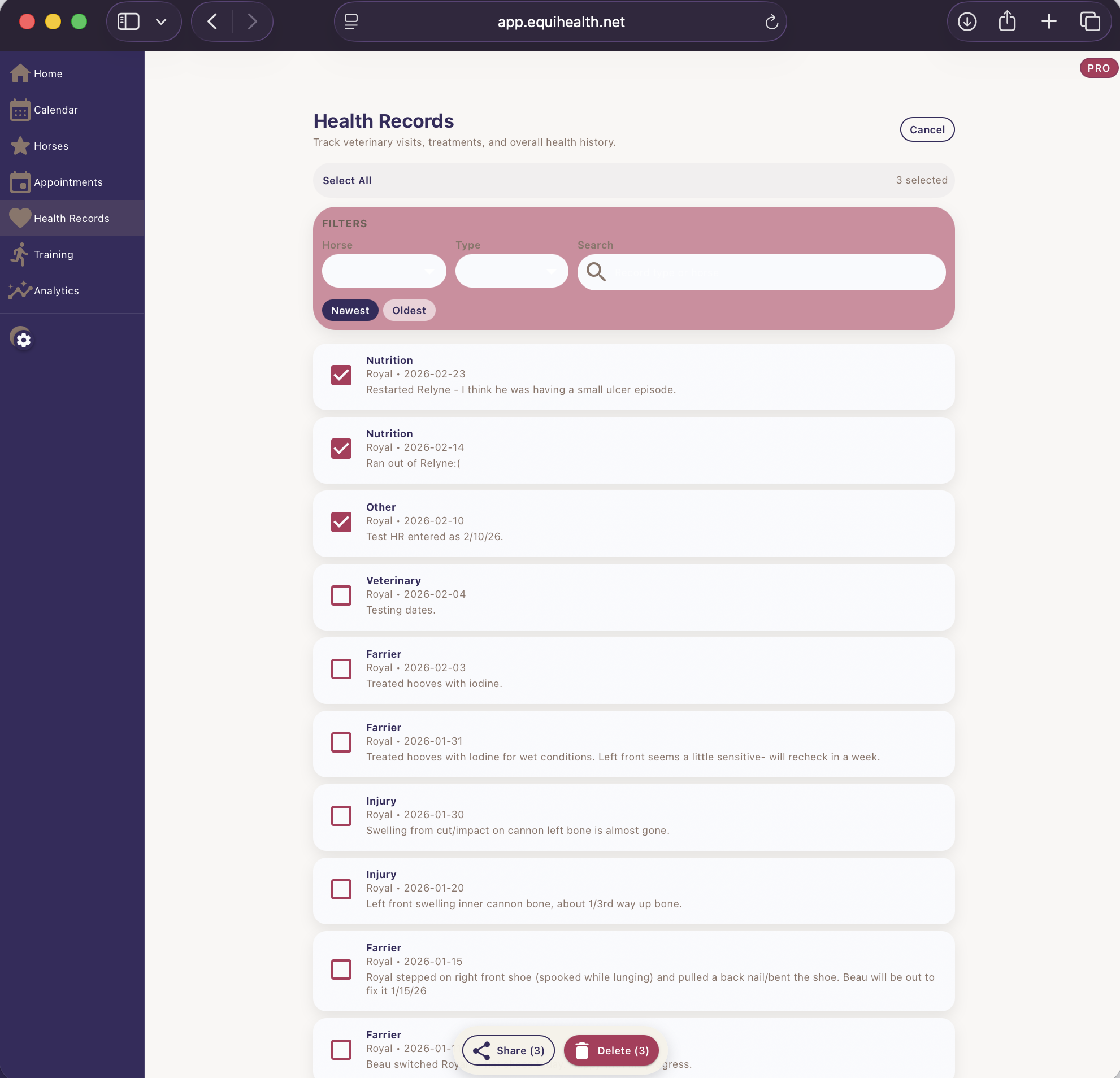 Select records to print or share with your vet or other equine professional.