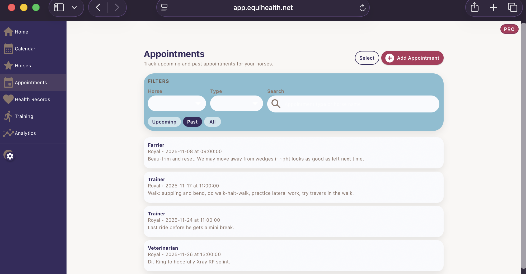 I recommend starting with the basics: after adding your first horse to the app, start adding your horse’s past and upcoming appointments. The more data you can add, the better it will be for tracking trends and seeing patterns emerge. The appointments will be added to your calendar page and allow you to see what you can plan for and what data to gather to get the most value from those appointments. For example, if you have the vet coming in three weeks, you can begin to add more detailed health tracking to the App so that you can report on trends to your vet.