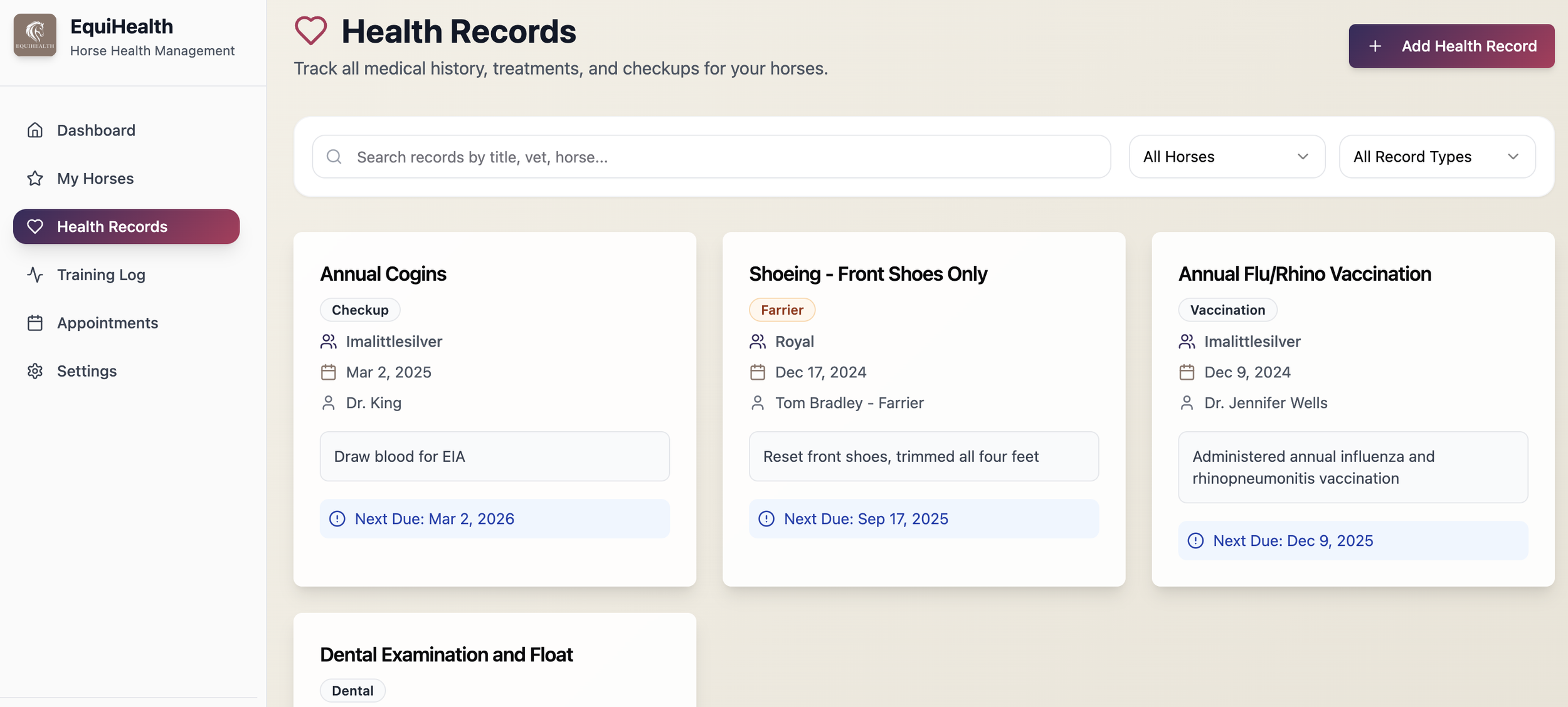 Keep track of each horse you own, train, or manage. Upload pedigree and health documents and keep track of vital biographical information.
